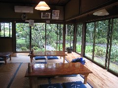 天栄、「そば茶屋てんえい」の店内 (庭には池もあり緑で囲まれています) |