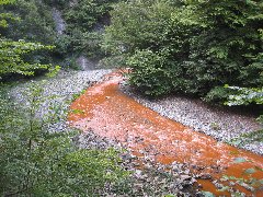 金山志賀坂林道、八丁峠からの景色 | 日窯鉱山近くの川 (オレンジ色で不気味です) |