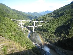 | 滝沢ダムからの景色 (放水の水煙に虹が出来ています) |