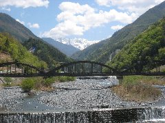 「赤石荘」から見える赤石岳 | 小渋川に掛かる有形文化財の小渋橋 (奥には赤石岳が見えます) |