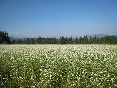 グリーンピア津南に向かう直線道路 | 津南町にあったそば畑 (そばの花が咲いています) |