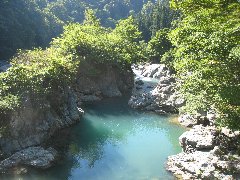 秋山郷、切明温泉「雄川閣」の露天風呂 (奥の河原を掘ると温泉になるようです) |