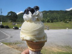 山田牧場、「見晴茶屋」の特性アイスクリーム (ブルーベリーと生クリームが乗っています) |