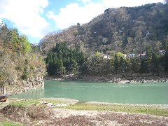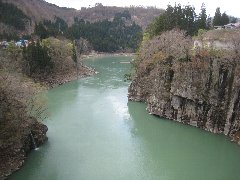 只見川に掛かる橋からの景色 (川の色が緑です) |