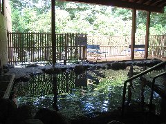 | 秩父、釜伏峠近くからの景色 | 秩父、「梵の湯」の建物 | 「梵の湯」の露天風呂 (すぐ先に荒川の流れが見えます) |