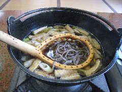 「ふもとや」のとうじそば (蕎麦を投じ籠に入れ暖めて食べます) |