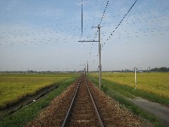 富山地方本線の線路 (田んぼの中を真っ直ぐ続きます) |