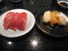 黒部、「氷見きときと寿し」の三種盛り (回転寿司です) |