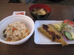 | 「はぎわら観光ヤナ」の鮎ご飯と鮎フライ | 高山のパン屋、「のぼりや」 | 高山、「つづみそば」の中華そば (シンプルで美味しいです) |