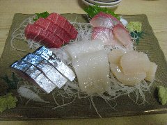 十日町、「豊吉」の刺身の盛合せ | 「豊吉」の貝柱バター (旨い!) |
