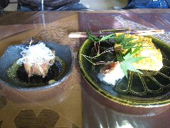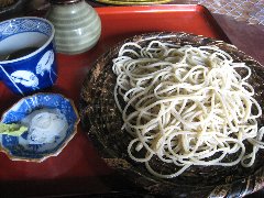 | 「草至庵」の豚の角煮と烏骨鶏の卵焼き | 「草至庵」のもりそば (新そばです) |