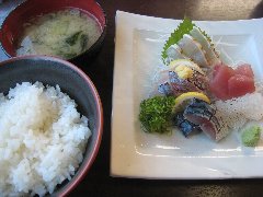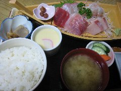 「浜善」の朝浜メニュー、刺身定食 (美味しいです) |