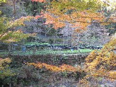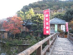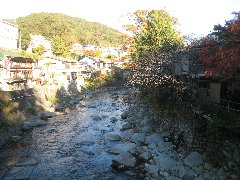 | 旧天城トンネルの入口付近の紅葉 | 旧天城トンネルの中 | 河津、「福田家」へ渡る橋 | 「福田家」へ渡る橋の上からの景色 (下は河津川です) |