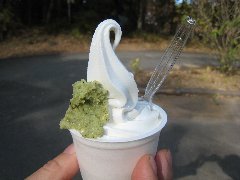 | 萬城の滝の近くのわさび田 | 萬城の滝レストハウスのわさびソフト (生わさびがたっぷり、旨い!) |