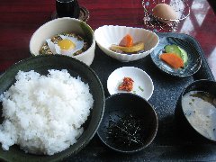 魚沼の広大な田んぼ | 魚沼、「我が家の卵」のきり玉丼定食 (ご飯にきりざいと卵を掛けます) |