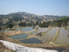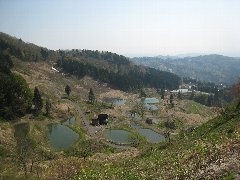 黒金橋からの水無川と越後駒ヶ岳 | 山古志の棚田 (手前は雪です) |