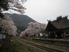 湯野上温泉駅の桜@ (茅葺き屋根の駅舎は日本でここだけです) |
