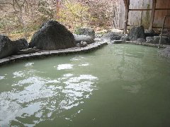 塩原、「元泉館」の露天風呂 (緑がかった乳白色の温泉です) |