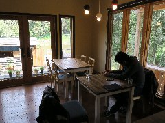 「ホタルカフェ」の店内 (大きな窓の外は緑がいっぱいです) |