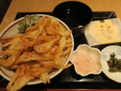 富山、「しろえび亭」の白えび天丼 (白えびの刺身付きです) |