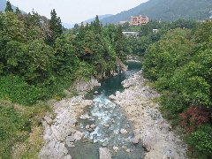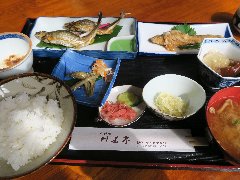 | 神岡、高原川に架かる橋からの景色 | 神岡、「川甚亭」の川甚定食 (鮎が3匹も使われています) |