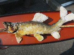 龍王峡、「五子」の鮎の塩焼き (焼く直前まで生きていました) |