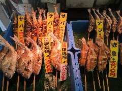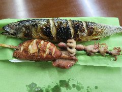 青海川、「日本海フィッシャーマンズケープ」の浜焼きコーナー | 「日本海フィッシャーマンズケープ」の浜焼き (サバ、イカ、イイダコ、旨い!) |
