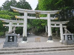 | 三峯神社の珍しい三ツ鳥居 (左右は狛犬ではなく狼です) |