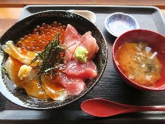 「たきわ」の3色丼 (ヅケ平目、マグロ、イクラ) |