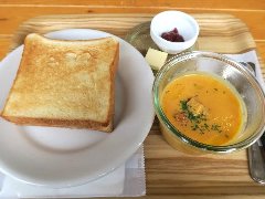 「亀の町ストア」のモーニングセット (スープはカボチャのポタージュ) |