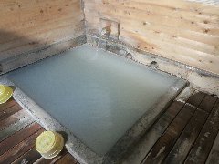 「峡雲荘」の露天風呂 (青っぽい乳白色の温泉) |