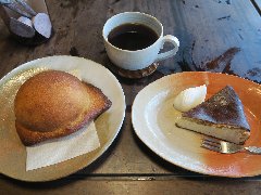 「夜麦」のコーヒーとチーズケーキと味噌パン (味噌パンは焼き立てでした) |