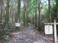 | 県道に交差する箱根旧街道 (杉に囲まれた石畳です) |
