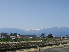 御勅使川の土手 (奥に南アルプスの雪山が見えます) |