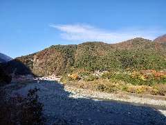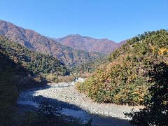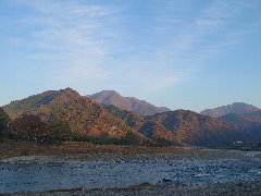 富士川町、富士川の河川敷 (低い山も色付いています) |
