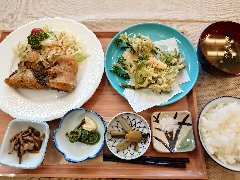 「おかみさん食堂」のつぶら揚げ定食と山菜の天ぷら (つぶらはニジマスです) |