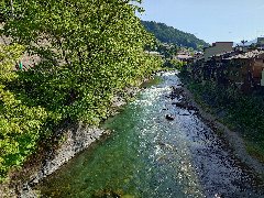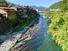 行人橋歩道橋より@ (きれいな川と崖家づくりが見えます) |