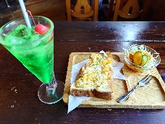「マイ・ガール」のメロンソーダと玉子トースト (レトロなお店です) |