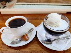 西大井駅から5、6分、三間通りから路地に入った辺りにあります。3階建ての一軒家、植木に囲まれていました。店内は、カウンター席が4つ、テーブルが6つありました。壁には絵画、趣味の色を感じます。とても静かで窓から緑が見えます。ライブも行うようです。アイスコーヒー(500円)とクリームあんみつ(650円)を注文しました。コーヒーはすっきりした味わいです。あんみつは黒糖付き、アイスクリーム、餡子、黄桃、みかん、パイン、寒天が入っていました。餡子がどっさりでした。美味しかったです。他には、各種ドリンク、ドライカレー、トースト、各種ケーキなどがありました。 |
