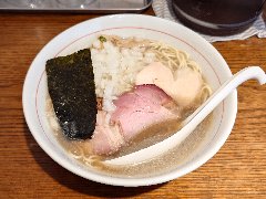 中華そば 大井町 和渦 | ラーメン | 東京都品川区大井 | ★★★ (2017.7.2) | 普通 | ![]() | JR大井町駅中央口から5、6分、大井三ツ又中通り交差点に近くの路地にあります。青いテント、店名が書かれた垂れ幕の前に花が生けてありました。店内は、カウンター席が6つ、かなり狭いです。白壁で明るいです。特製塩そば(1000円)と限定ランチサービス鶏おろしポン酢丼(10円)を注文しました。ワンタン、チャーシュー(鶏と豚)、穂先メンマ、味玉、三つ葉、ゆず、刻みネギが入っていました。麺は細めのストレートで量は多め、スープは水と鶏だけで作るそうで、この日は名古屋コーチンのガラ、天草大王の丸鶏と書かれていました。旨み濃厚な鶏出汁で油は多めですが優しい味でとても美味しいです。驚きの10円丼は、ポン酢がさっぱりとして美味しいです。他には、醤油そば、炙りチャーシュー丼などがありました。 |