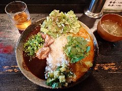 国分寺駅北口から3分ほど、駅の東の繁華街にあります。マンションの1階、白壁でお洒落感ある外観です。店内は、カウンター席が4つ、テーブルが4つありました。やや薄暗くカフェのような雰囲気です。肉味噌キーマスペシャルカレー(1280円)とチキン(200円)を注文しました。辛さとライスの量を選べます。スプーンが大きいです。ご飯の上に肉味噌キーマと卵黄、カレーには豚肉、焼きチーズ、納豆、アチャール、刻みネギなどが乗っていました。カレーはシャバシャバで、スパイスとココナッツが効いていました。いろいろ混ぜると面白いです。美味しかったです。ちょっと高いかな。チキンのトッピングは小さくてイマイチでした。他には、焼チーズやさいカレー、スタミナカレー、チキンカレーなどがありました。 |